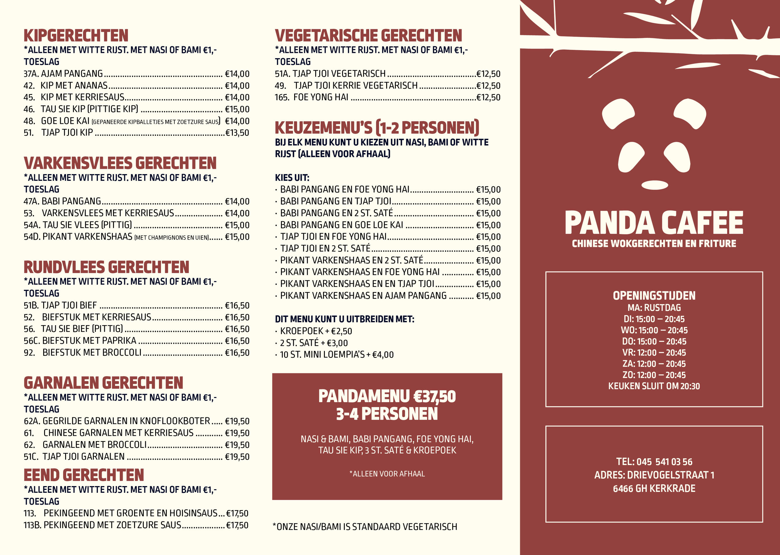 Geniet van smaakvolle Oriëntaalse en Chinese gerechten, gecombineerd met verse frites en lekkere snacks.Ruime parkeergelegenheid en makkelijk bereikbaar per auto, fiets of te voet.U kunt uw bestelling ter plaatse nuttigen, zowel binnen als op ons overdekte terras.Wij heten u van harte welkom bij Panda Cafee Kerkrade.